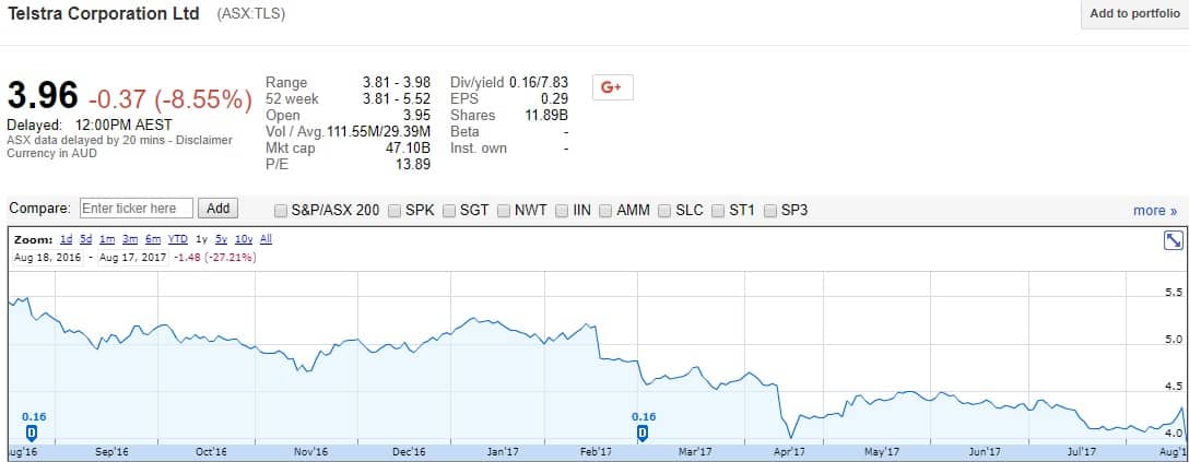 The Telstra Corporation Ltd (ASX: TLS) share price is down 8% to $3.96 at the time of writing, after the company's results revealed weaker mobile earnings and a ~30% cut in the dividend forecast for 2018. Telstra shares are now down 27% over the past year: