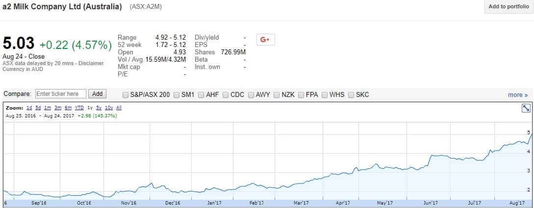 The A2 Milk Company Ltd (ASX: A2M) share price has absolutely rocketed this year. It took 6 months to go from $2 to $3, two months to go from $3 to $4, and just one month to go from $4 to $5. The share price is up 145% this year: