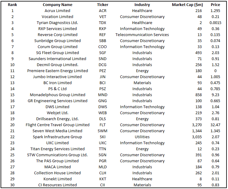 Although it is not exactly correct I excluded the companies from Matt's list that were smaller than $100 million in market capitalisation. I also excluded Premiere Eastern Energy (ASX: PEZ) because it had a share price of $0 according to the table.