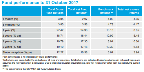 Other overweight positions in this fund include Boral Limited (ASX: BLD), Reliance Worldwide Corporation Aus P Ltd (ASX: RWC) and Woodside Petroleum Limited (ASX: WPL).