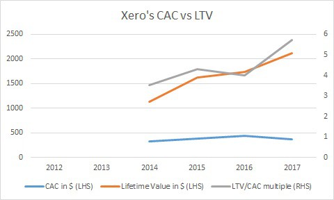 The second thing I wanted to check at was the actual value generated by each new customer. To do this I divided the 'Lifetime Value' of a customer (LTV) by the Cost of Acquiring a Customer (CAC) (this data has been provided in Xero's annual reports since 2015):
