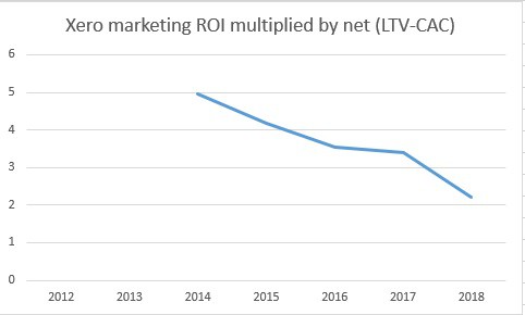 In simple terms, the grey line suggests that Xero could generate revenue equivalent to 5.7x the cost of acquiring that customer. Now revisit the first chart where I suggested that the return on marketing dollars is falling and could be as low as 0.385 in 2018.