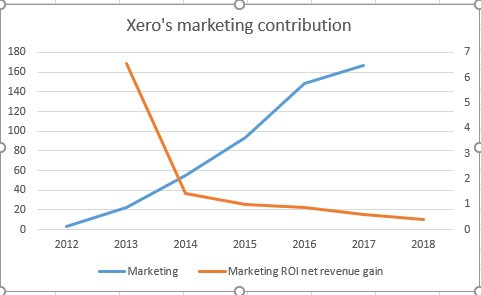 You can see in the above chart that the return on Xero's marketing expenditure (orange line) has fallen sharply and continues to decline, even as marketing expense in millions of $ (blue line) continues to grow.
