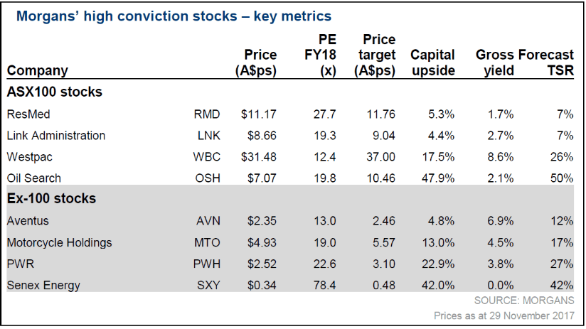 At the smaller end of the market, the stocks that Morgans is backing for 2018 include oil & gas producer Senex Energy Ltd (ASX: SXY), Motorcycle dealership MotorCycle Holdings Ltd (ASX: MTO), retail showroom operator Aventus Retail Property Fund (ASX: AVN) and automotive cooling solutions developer PWR Holdings Ltd (ASX: PWH).