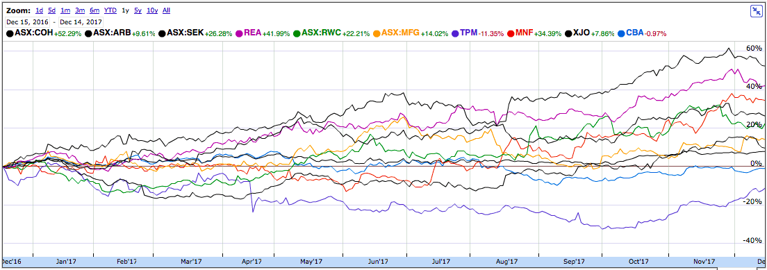 Reliance Worldwide Corporation Aus (ASX: RWC) is up 22.2% plus dividends around 1.8%. Another founder led business it's growing strongly overseas and may post another strong year ahead.