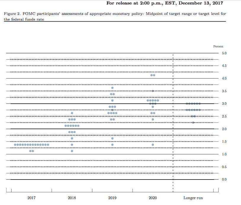 The dots on the US Fed's chart below show how the majority of its members expect U.S. rates around 2.25% this time next year.