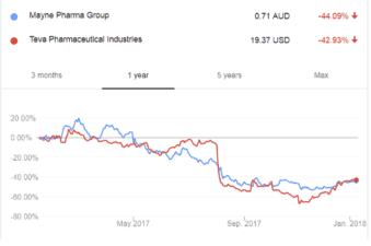 If you examine a 1 year chart comparing the share price movements between Teva and Mayne you can see a strong correlation in movement. The significant share price declines of 2017 for generic drug manufacturers was attributed to ongoing price deflation driven by the consolidation of U.S. buying groups and aggressive competition within the generics market. Mayne's trading update in late November showed that group revenue to the end of October had declined by 12% to $151 million compared to the prior corresponding period. The company's largest division, the Generics Product Division, saw its sales fall by 10% to US$88 million on the prior corresponding period.