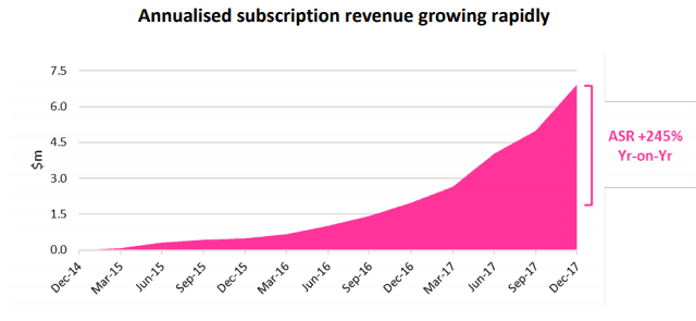 This morning, the headline figure is that annualised subscription revenue (ASR) reached $6.9 million as at 31 December 2017, up from $5 million as at 30 September 2017 and $2 million as at 31 December 2016. This translates to annual subscription revenue growth of 245% over the past year.