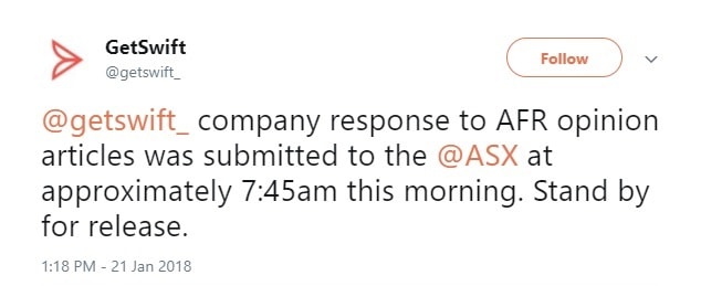 On Monday, GetSwift's official Twitter account tweeted that it had submitted a response to the ASX at 7.45am: