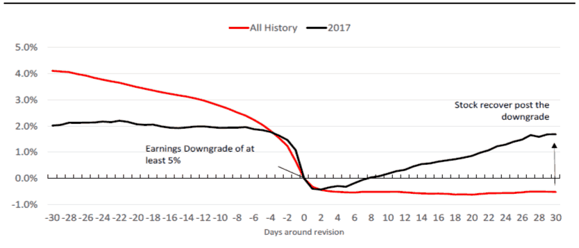 The broker had a hard look at the trading performance of companies that have seen a 5% or greater cut in their earnings per share (EPS) forecast by analysts in 2017.
