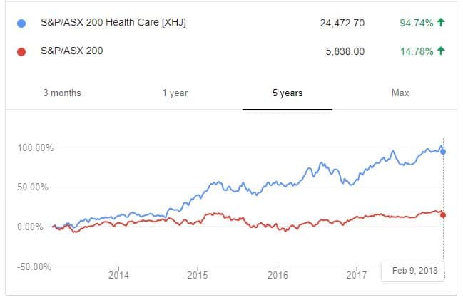 Over the last five years the steroid injected S&P/ASX 200 Health Care Index has destroyed the returns of the S&P/ASX 200 by over 4x, led by big names like ResMed Inc. (CHESS) (ASX: RMD), Cochlear Limited (ASX: COH) and CSL Limited (ASX: CSL).