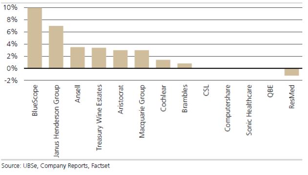 On the other end of the scale, RESMED/IDR UNRESTR (ASX: RMD), better known as ResMed, is facing an earnings drag from the tax changes as UBS believes that any tax cut benefit will be more than offset by the other adjustments to US tax rules and changes to the Australian tax code to limit the shifting of profits to countries with more favourable tax treatments.
