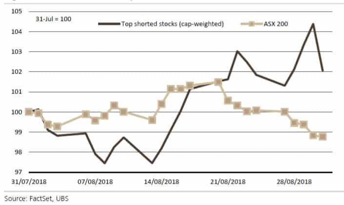Short-sellers are those who sell borrowed stock in the hope of buying it back at a lower price later to profit from the difference. UBS noted that many of the hot favourite short-sold candidates have either posted better-than-expected results or have benefited from merger and acquisition (M&A) activity with TPG Telecom Ltd (ASX: TPM) the most obvious example.