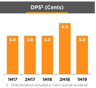 At its recent half-year results, Hanson declared a dividend of 3.0 cents per share for the half year. This was flat on the same period in 2018 and, if we ignore the special dividend of 1 cent per share paid in September 2018, at the current share price of $3.05 per share offers a trailing dividend yield of 2.0%, fully franked.