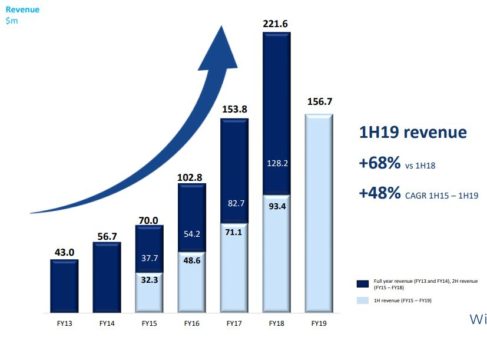 At the company's half-year update last month WiseTech presented revenue growth of 68% and Net profit after tax (NPAT) growth of 48% for the six months to 31 December 2018 and provided guidance of full-year revenue growth of between 45% to 51%.