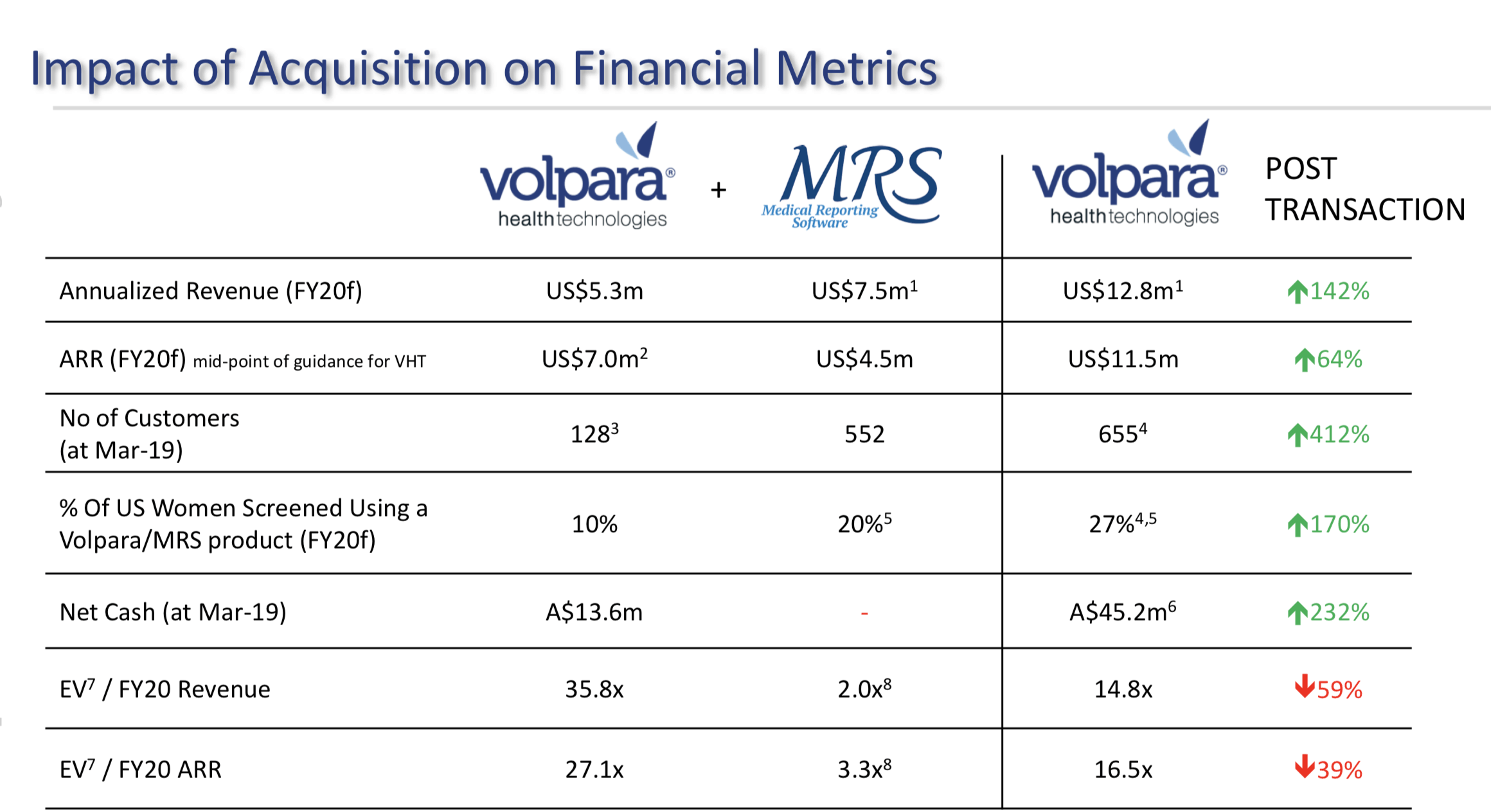 Volpara included the chart below in its investor presentation, which shows how the financial arbitrage of raising cash on a 35.8x FY20 enterprise value (EV)/sales ratio to buy a business trading on just 2x FY20 EV/sales ratio makes the acquiring business better value.