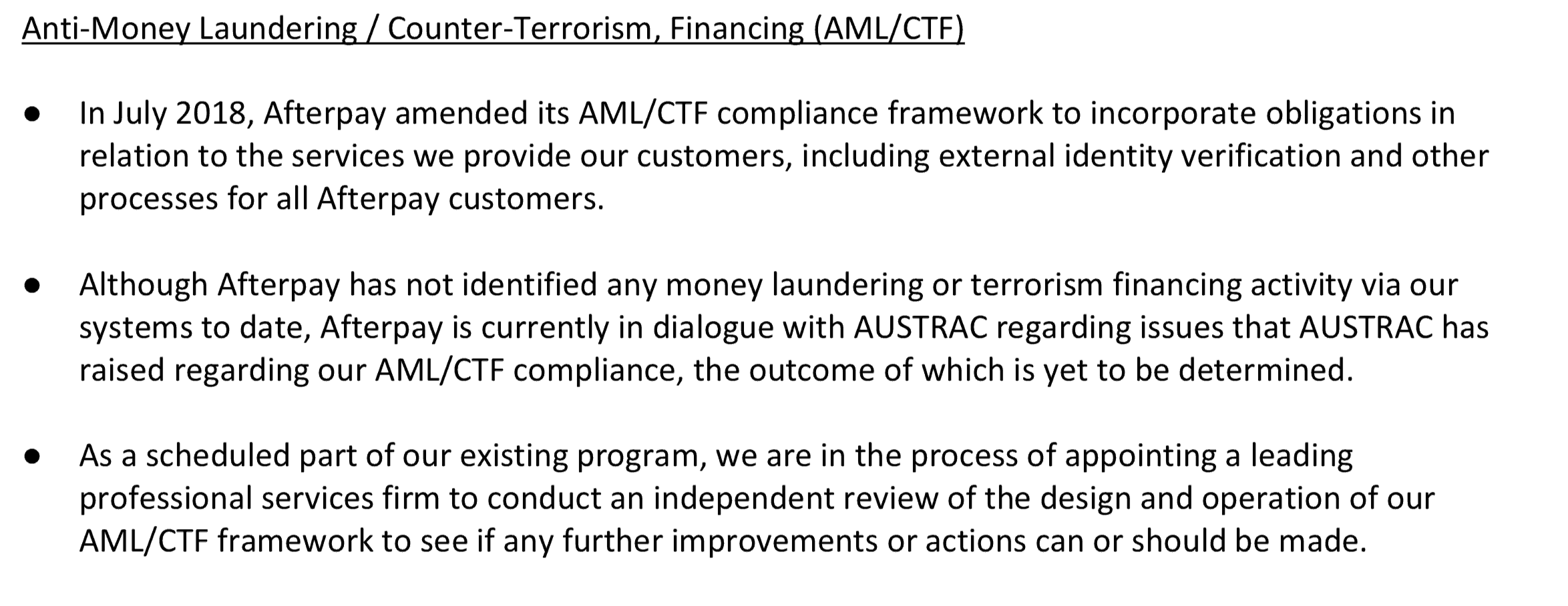 Another point for investors to consider today is that the company admitted the anti-money laundering regulator AUSTRAC has been paying close attention to Afterpay since July 2018 alongside its obligations under the onerous AML/CTF Act 2006.