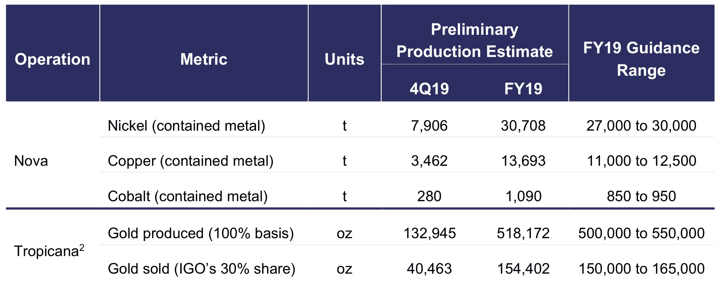 The good news is that production from its Nova nickel, copper and cobalt mine exceeded full year production guidance, while production at its Tropicana gold mine also came in within the full year guidance range. As we can see from the chart below.
