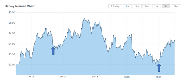 Harvey Norman Holdings Limited (ASX: HVN) is one of Australia's most successful consumer electronics retailers, as well as white goods and furniture. It relies on a confident retail environment to convince you to upgrade your TV or buy the latest gaming console. The two dark blue arrows in the chart below indicate the share price 11 September 2015, $3.93, and 21 December 2018, $3.11.