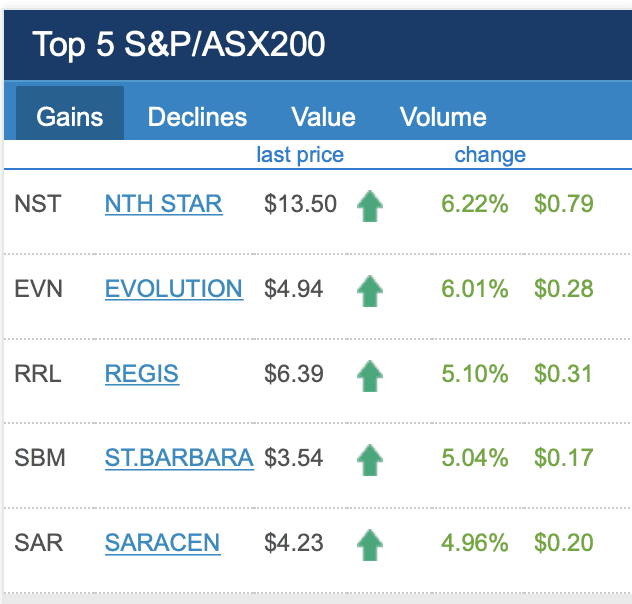 The best shares on the S&P/ ASX200 (ASX: XJO) today are Australia's gold miners such as Northern Star Resources Ltd (ASX: NST), Evolution Ltd (ASX: EVN), Regis Resources Ltd (ASX: RRL), Saracen Resources Ltd (ASX: SAR) and St Barbara Resources Ltd (ASX: SBM).
