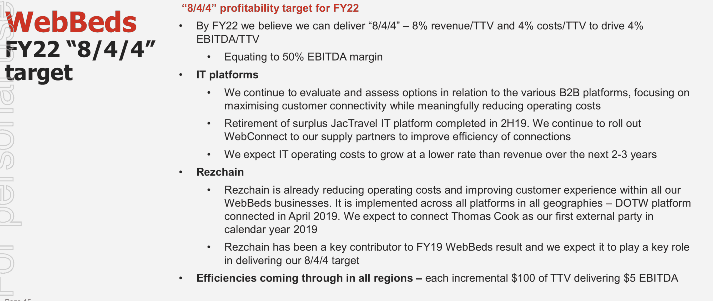 WebBeds aims to lift its margins to earn 8% in revenue from each booking (TTV), with 4% costs on TTV, to translate into 4% EBITDA on TTV for Webjet's gross profit margin. In effect this would equal a 50% EBITDA margin by FY 2022, way above the 36.4% delivered today.