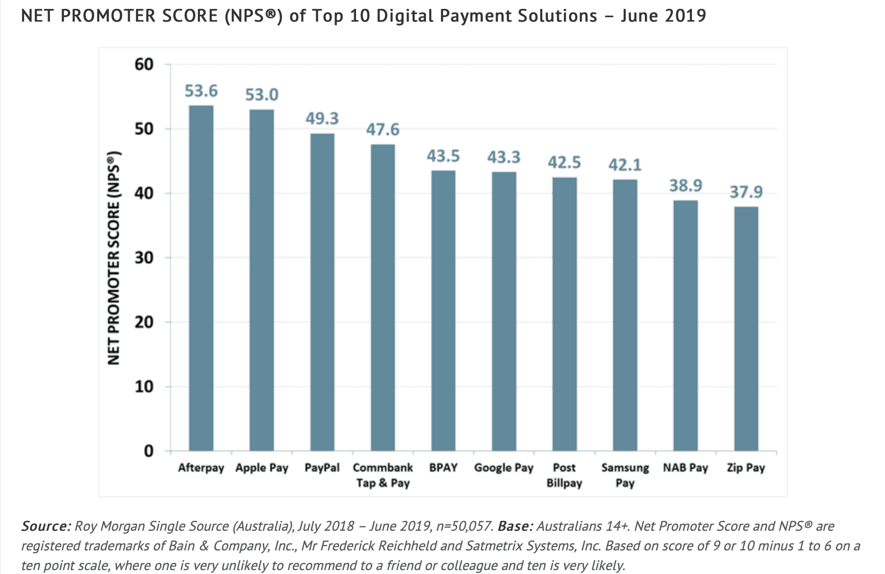 The point for investors is that in having a 'net promoter' score ahead of payment giants like Apple, Google and PayPal it seems Afterpay's alternative to a credit card product is wildly popular.