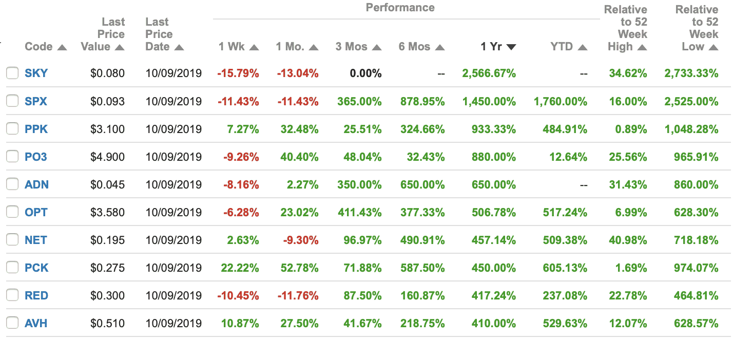 Sky Metals Ltd (ASX: SKY) is up 2,566% but only to 8 cents. It's an Australia-based tin exploration and mining company. Based on 250 million shares on issue it has a market value of just $20.4 million.