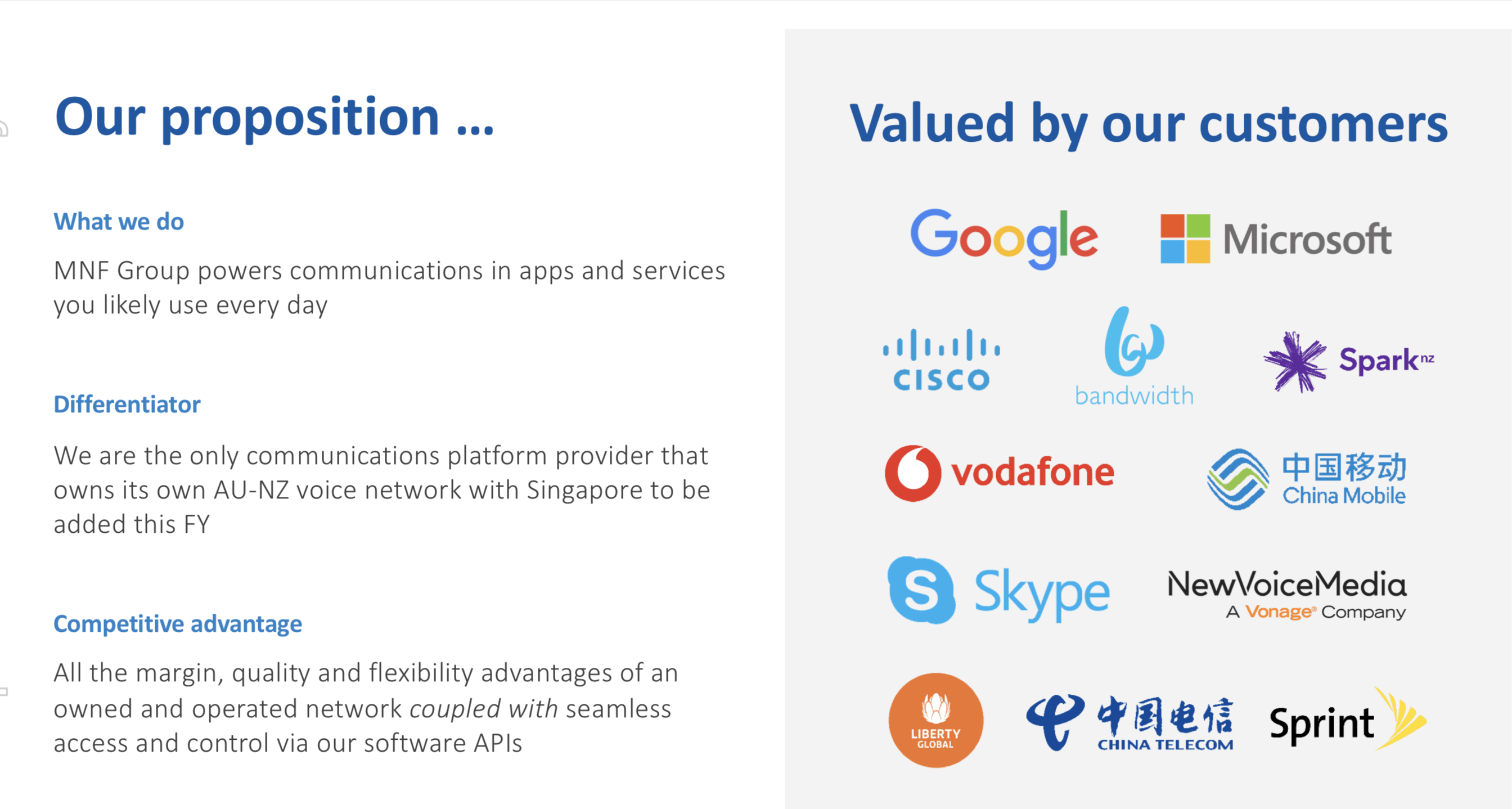 MNF has also been investing heavily in building out its VOIP global structure including the physical space and hardware required for new points of presence in the US, Europe, and Asia Pacific region.