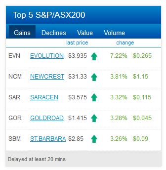 That's right, ASX gold miners are the shining light of the markets on this Monday afternoon. All 5 biggest gainers today – Evolution Mining Ltd (ASX: EVN), Newcrest Mining Limited (ASX: NCM), Saracen Mineral Holdings Limited (ASX: SAR), Gold Road Resources Ltd (ASX: GOR) and St Barbara Ltd (ASX: SBM) – boast depositories of the yellow metal.