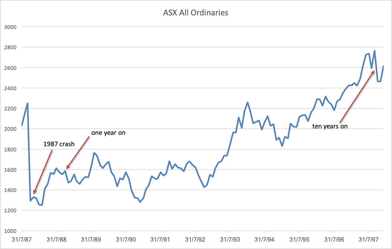 In the 1987 crash, the ASX lost 25% of its value in a day and over 40% of its value by the end of October 1987. But in the year following the crash, the market regained 22.5%. Ten years after the crash, the market was up over 90%, as demonstrated in the graph below.