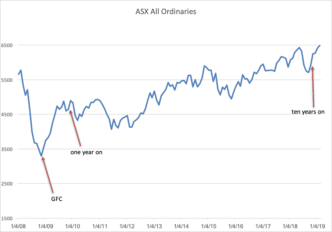 Over the course of the GFC, the ASX fell nearly 50%. But in the first year of recovery, it bounced back 41%. In the 5 years following the lowest point of the GFC, the market rose an impressive 64%. A decade on and the market was up 90%, as seen in the graph below. If the stock market is good at anything, it is bouncing back.